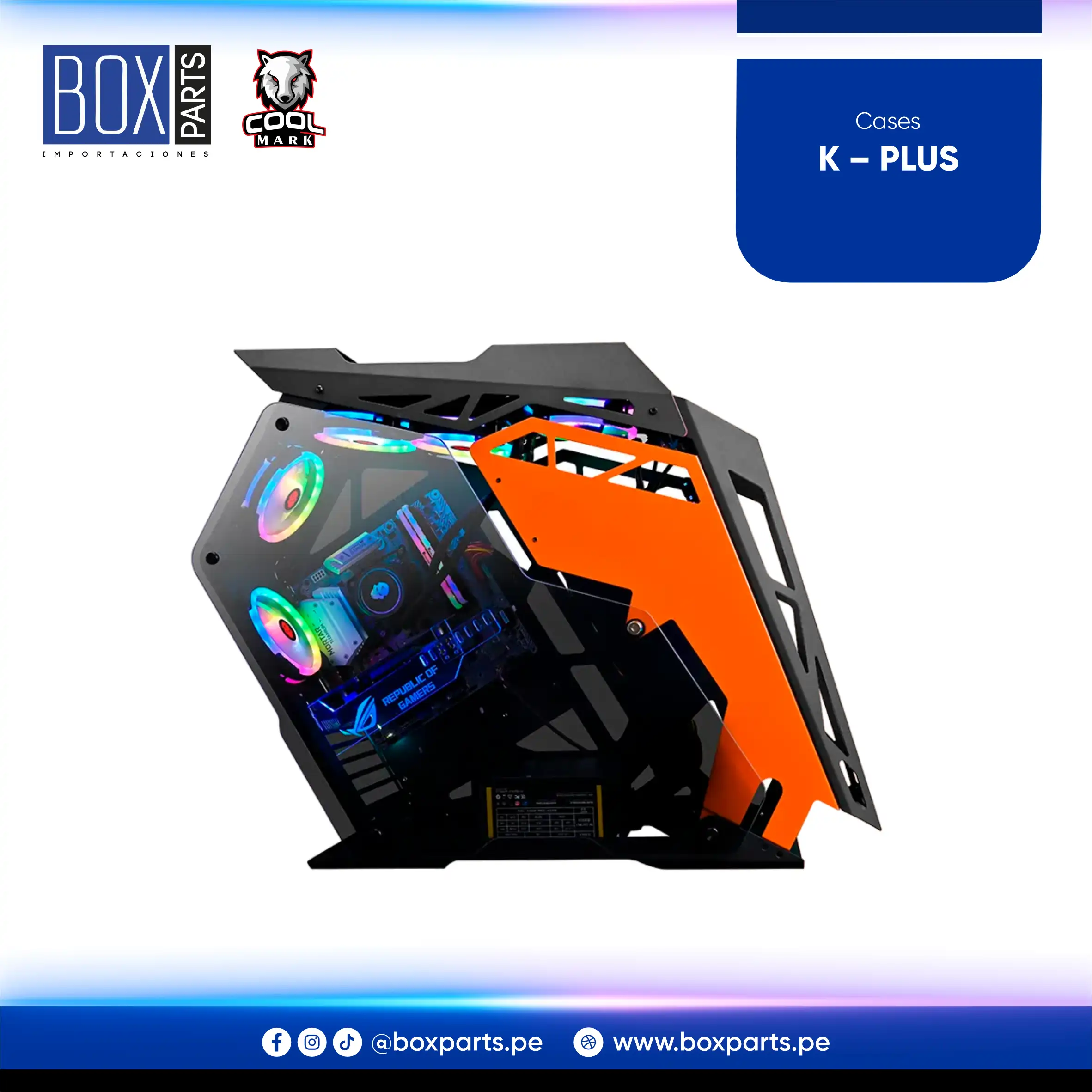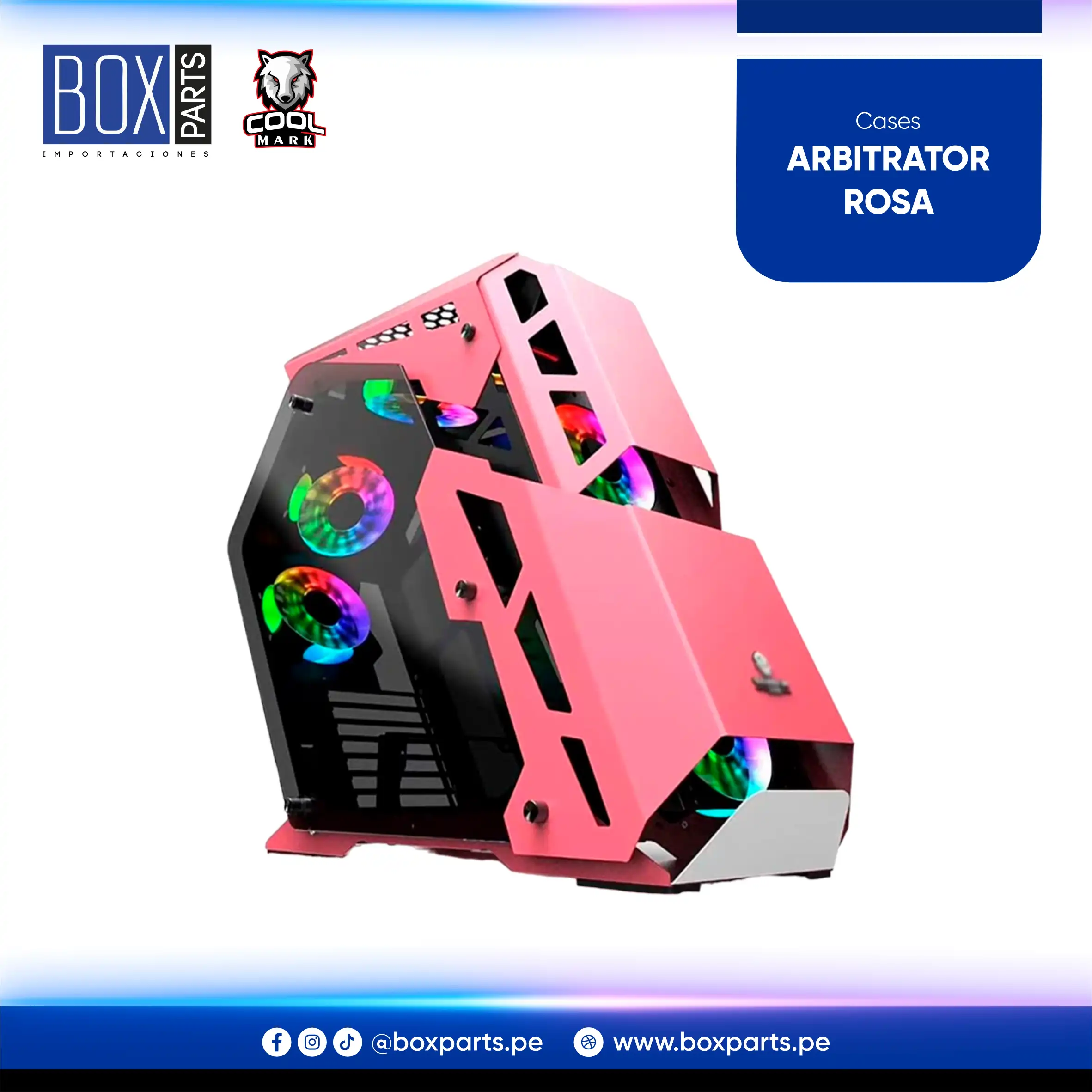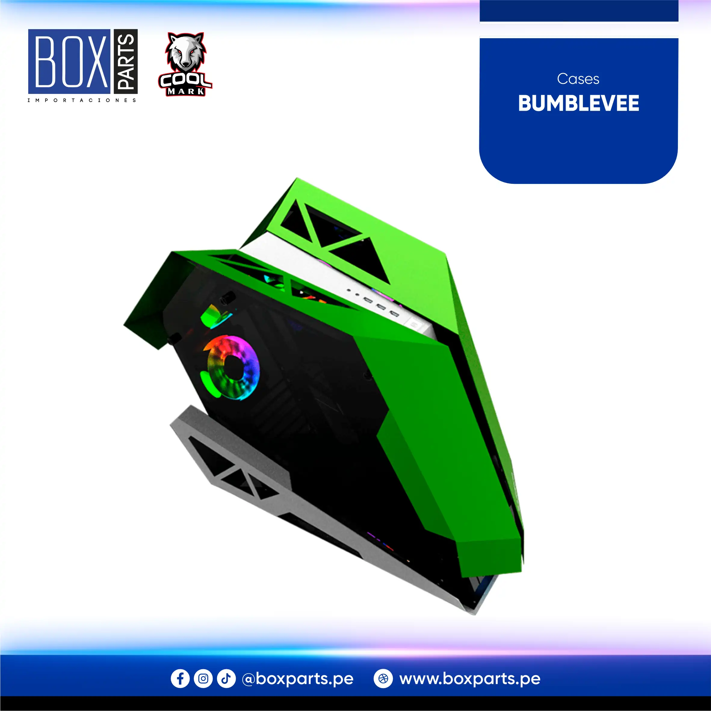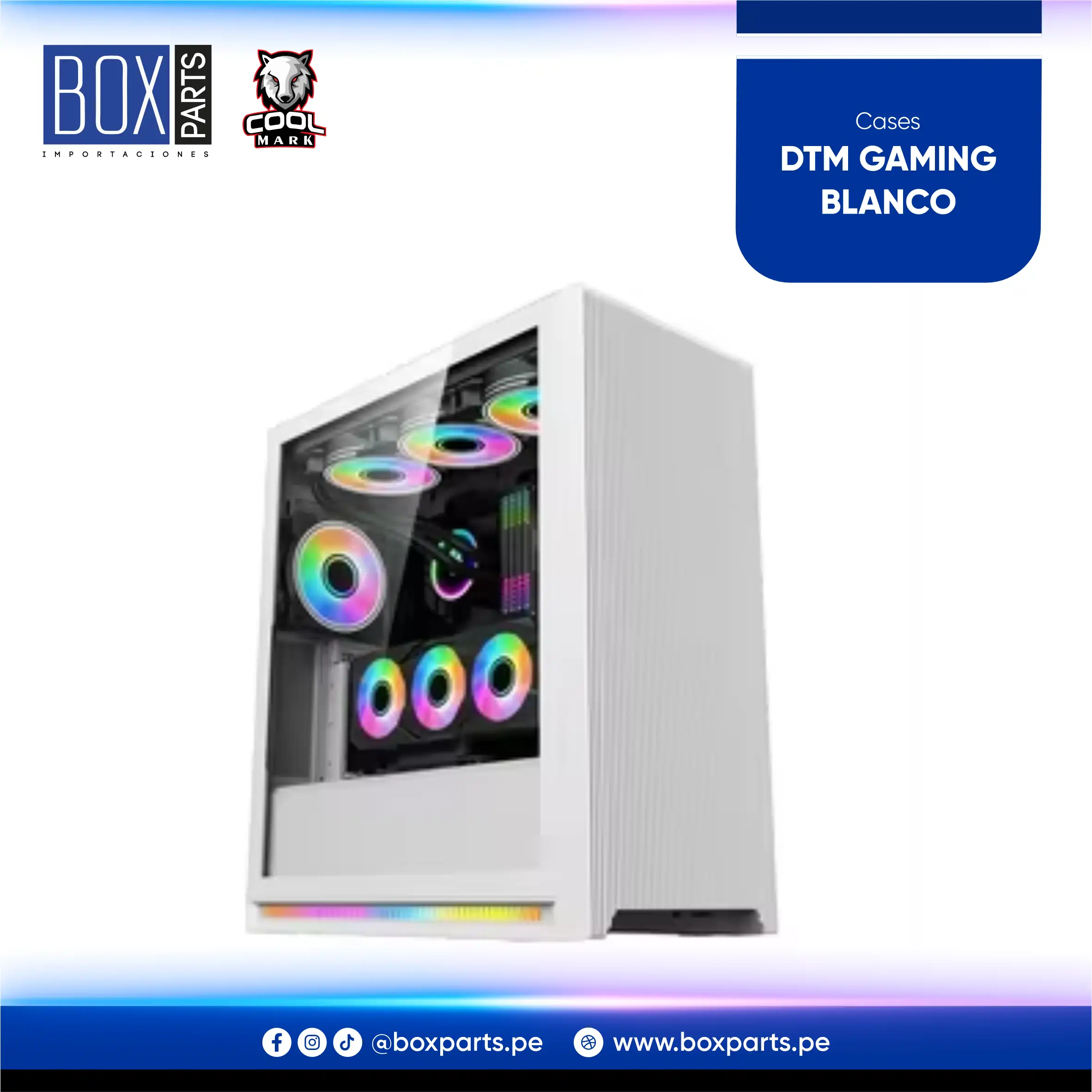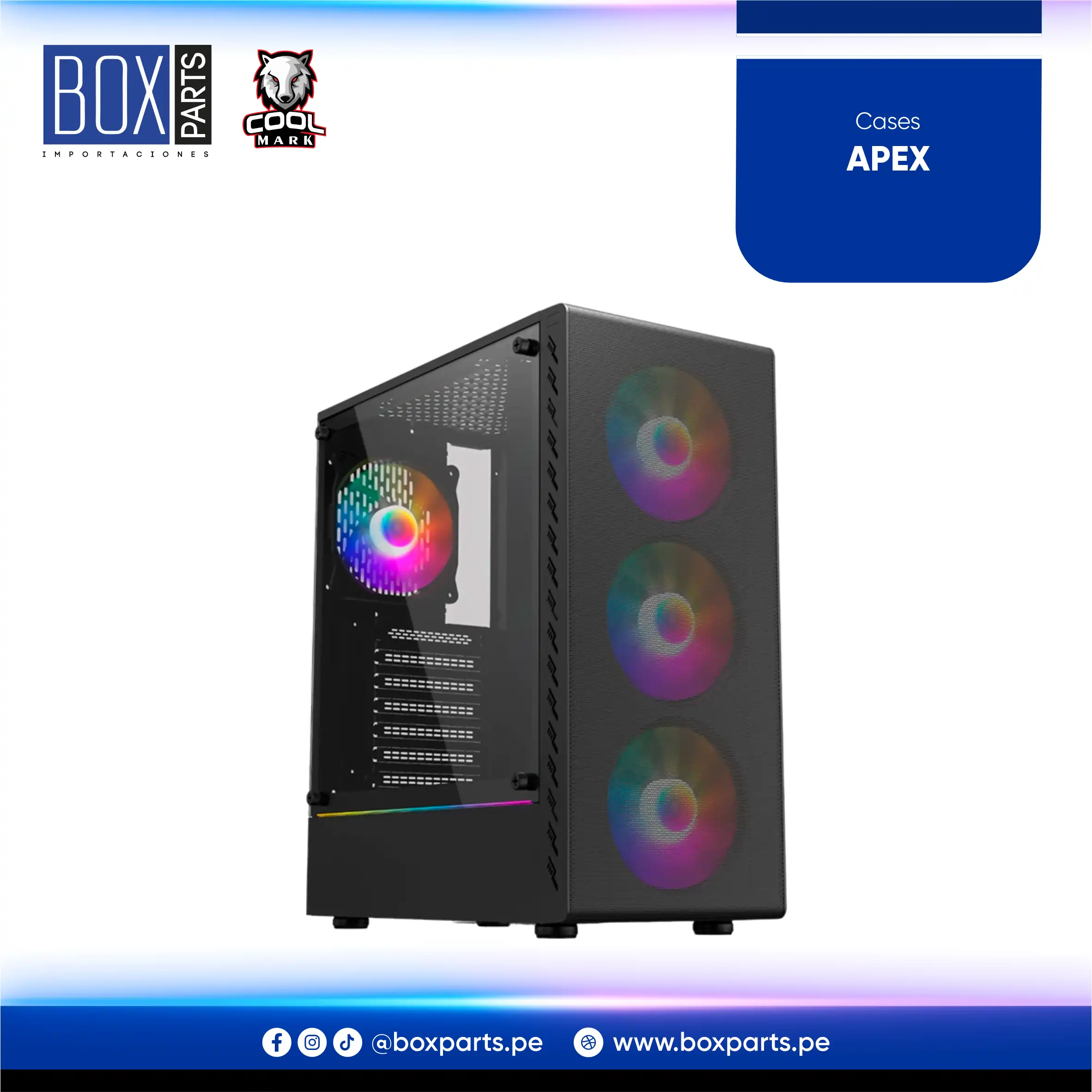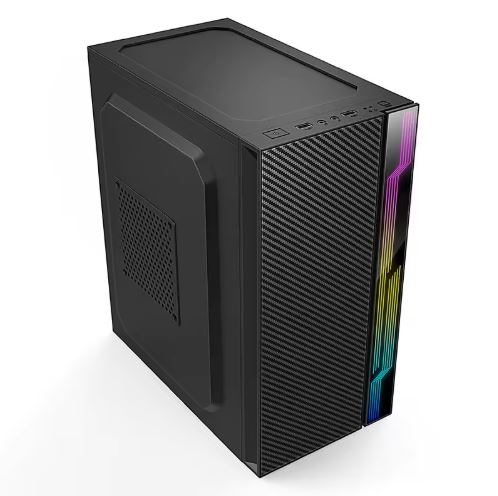 Case gamer con diseño moderno, iluminación RGB frontal y panel lateral de vidrio templado. Ideal para una PC visualmente atractiva y funcional.